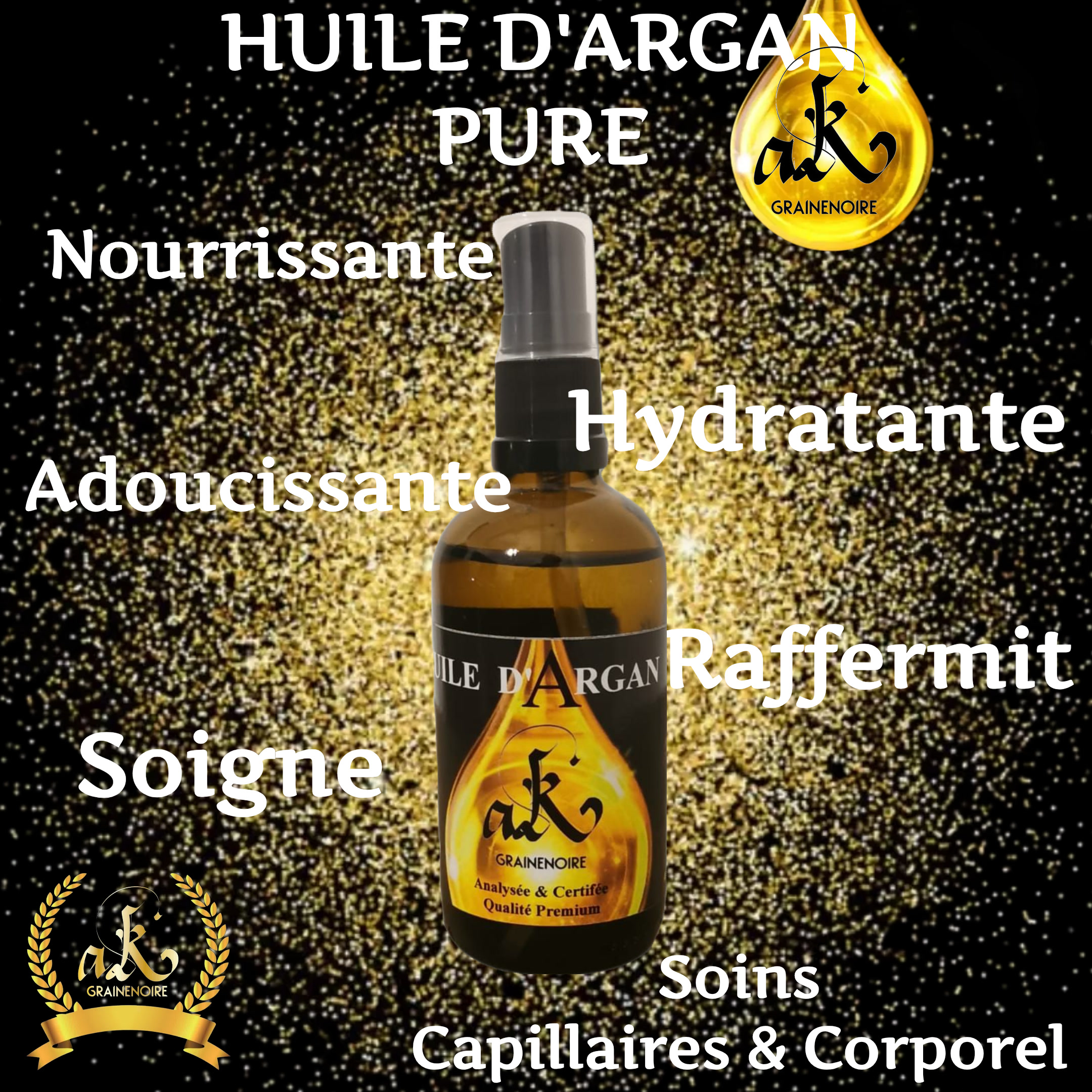 | L’huile d’ARGAN ou l’huile d’argane est une huile végétale produite à partir des fruits de l’arganier et riche en vitamine A, vitamine E (Tocophérol), en antioxydants et en acides gras essentiels.
